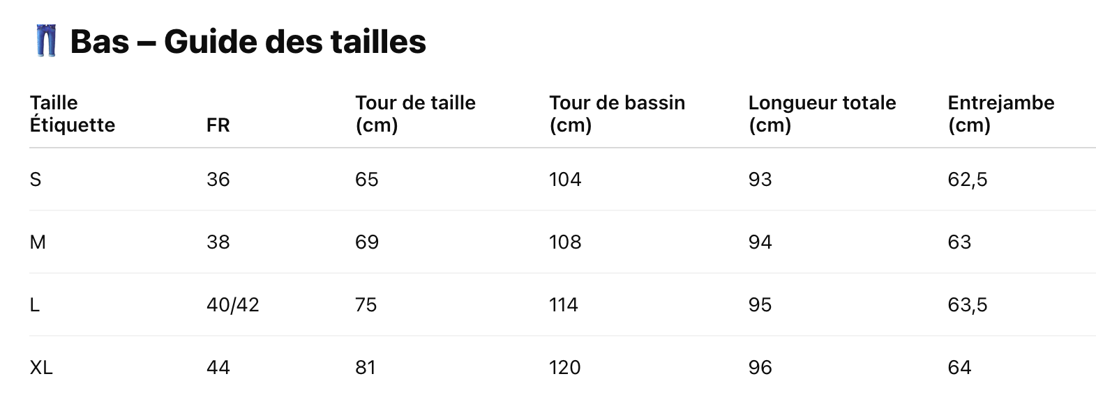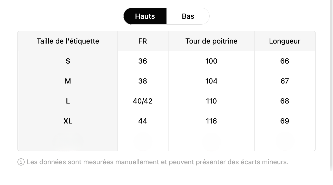 Choisissez votre taille selon votre mensuration principale (poitrine ou hanches). Coupe légèrement décontractée : entre deux tailles, optez pour une au-dessus pour plus de fluidité, ou une en dessous pour un rendu structuré.